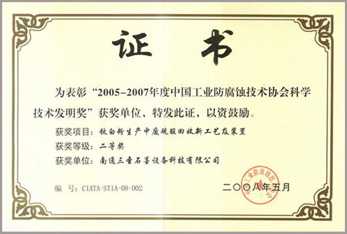 該技術(shù)通過了江蘇省科技廳科技成果鑒定,先后獲得:南通市人民政府科學技術(shù)進步二等獎、武漢市人民政府科學技術(shù)進步二等獎、中國工業(yè)防腐蝕技術(shù)協(xié)會科學技術(shù)發(fā)明二等獎并在多家鈦白企業(yè)中得到了應(yīng)用。